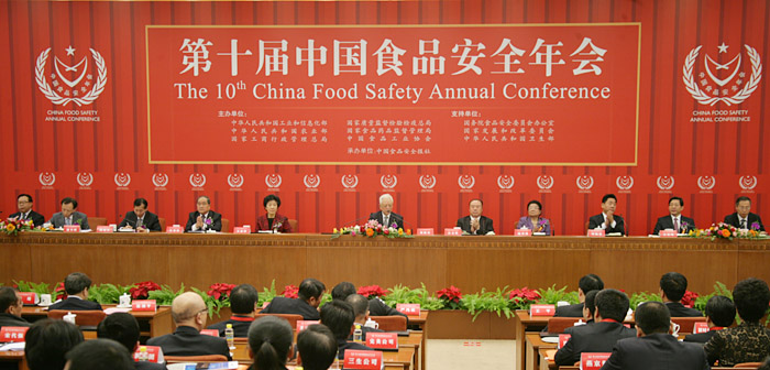 11月17日,由工业和信息化部、农业部、国家工商总局、国家质检总局、国家食品药品监督管理局、中国食品工业协会联合主办,以“确保食品安全构建和谐社会”为主题的第十届中国食品安全年会在京开幕。全国人大常委会副委员长周铁农,全国政协副主席白立忱、王志珍,十届全国人大常委会副委员长、中国食品安全年会组委会名誉主任顾秀莲等领导出席开幕式,并向为第十届年会做出突出贡献的单位颁发了年会徽标。