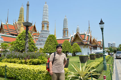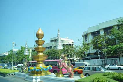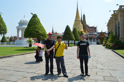 经过4个多小时的飞行,到达泰国首都曼谷。走出泰国国际机场大厅时,一股潮湿的热浪迎面扑来,看着机场大道两旁停靠的旅游大巴和出租车,大家再也按捺不住激动的心情,我们上旅游大巴前,热情好客的泰国姑娘送上鲜花并和每一位合影留念。
