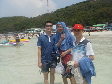 当我们坐着快艇,踏上芭堤雅最出名的金沙滩时,洁白细腻的沙子踩在脚下,淡绿色的海水萦绕身边,湛蓝的天空、灿烂的阳光、欢快的嬉水声,这一切的一切,使人心旷神怡,立刻就感受到轻松和假日的氛围。看!一张美丽的戏水图、一具完美的沙滩“人体雕塑”,一群快乐的“美人鱼”,将这美好的瞬间永远的留在了相机里、沙滩上、人们的记忆中。
